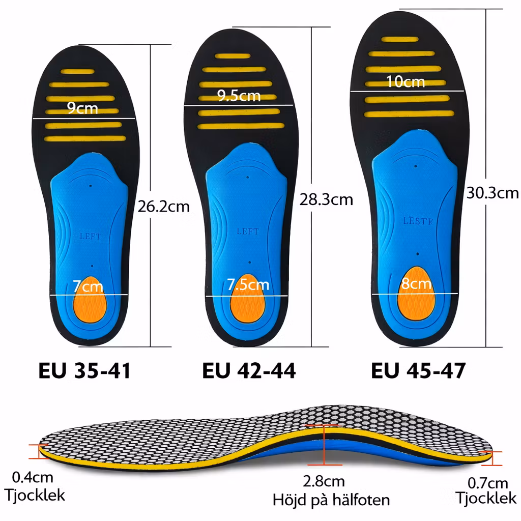 • Inläggssulorna är speciellt utformade för idrott och sport, och passar bland annat vid löpning och vid snabba bollsporter.